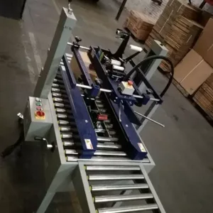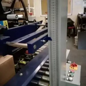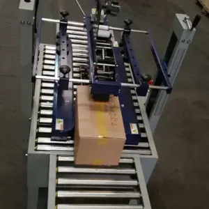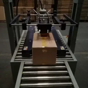 • Se introduce la caja manualmente y dos cintas adhesivas cierran las solapas superiores e inferiores, mientras la caja es arrastrada por 2 cintas laterales.